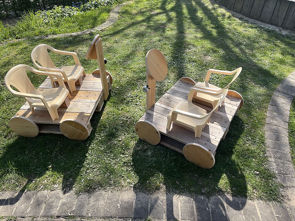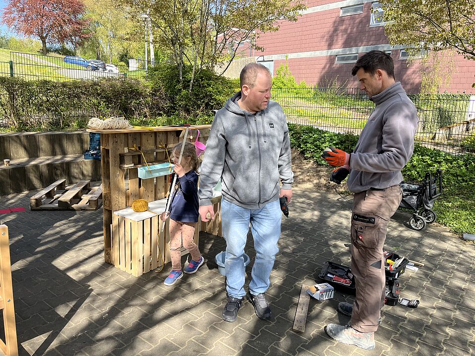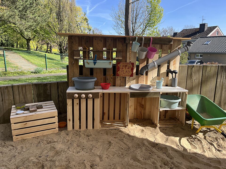 Dank zahlreicher Materialspenden in Form von Holz und Paletten konnten wunderschöne und individuelle Spielgeräte entstehen. Auch an Werkzeug fehlte es nicht: Viele Familien brachten Bohrmaschinen, Stichsägen, Hammer und Nägel mit und unterstützten tatkräftig bei der Umsetzung. Als Inspiration dienten einige wenige Bildvorlagen – der Rest entstand mit viel Köpfchen, handwerklichem Geschick und ganz eigenen Ideen. So entwickelten die Gruppen kreative Matschküchen, Autostationen und weitere Spielmöglichkeiten, die für noch mehr Spielspaß auf dem Außengelände sorgen.