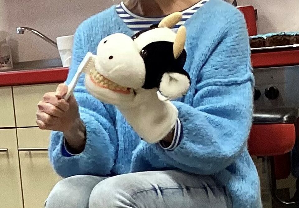Mit einer lustigen Kuh-Handpuppe brachte die Zahnärztin den Kindern spielerisch das Thema Zahngesundheit näher und bereitete sie auf die bevorstehende Untersuchung vor.