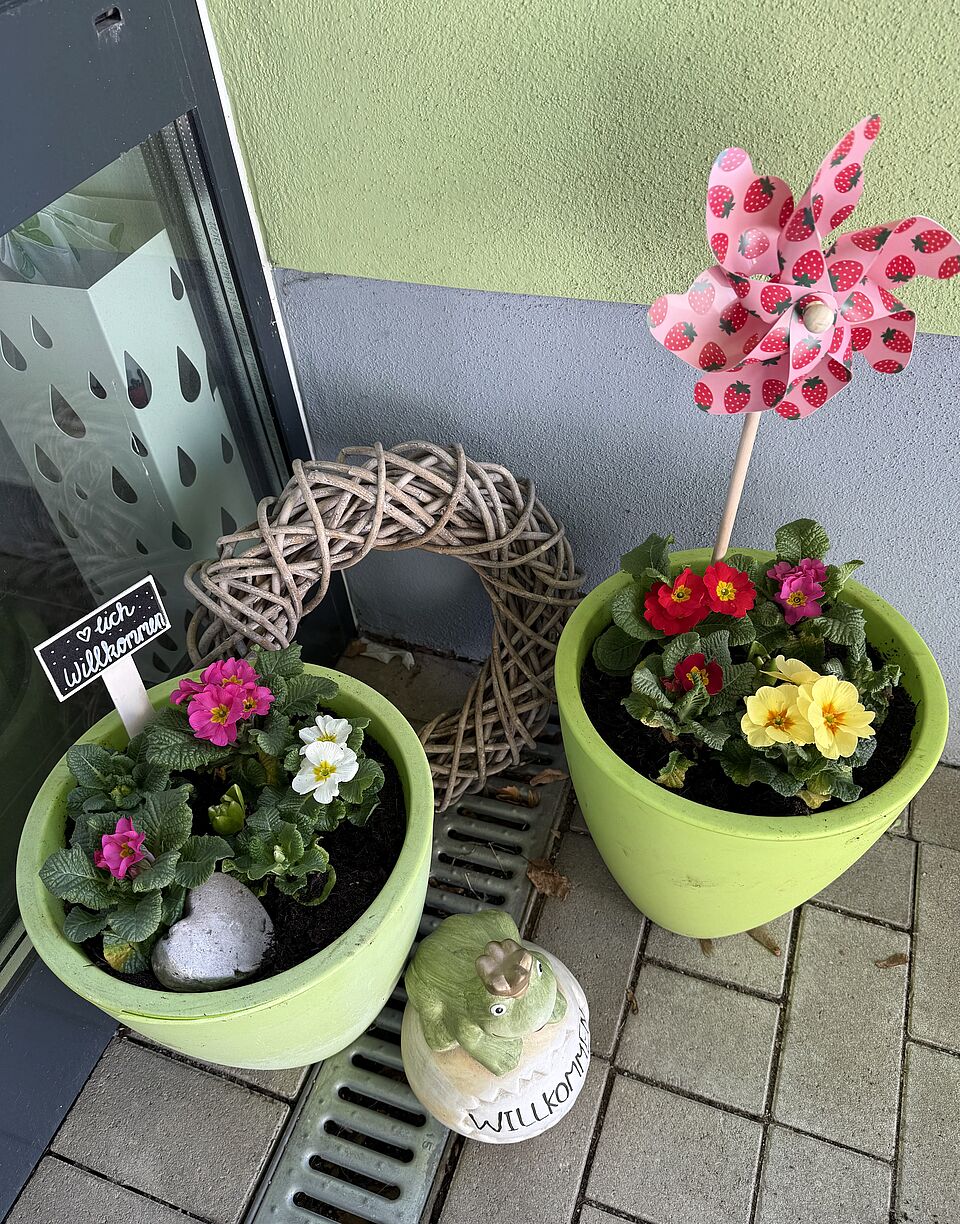 Mit dem Bollerwagen gings los und wir haben viele, farbenfrohe Blumen gekauft. Der Eingang wurde schön gemacht und auch der Balkon hat ein paar bunte Tupfer bekommen. Es macht uns so viel Spaß beim Sonnenschein draußen zu sein.