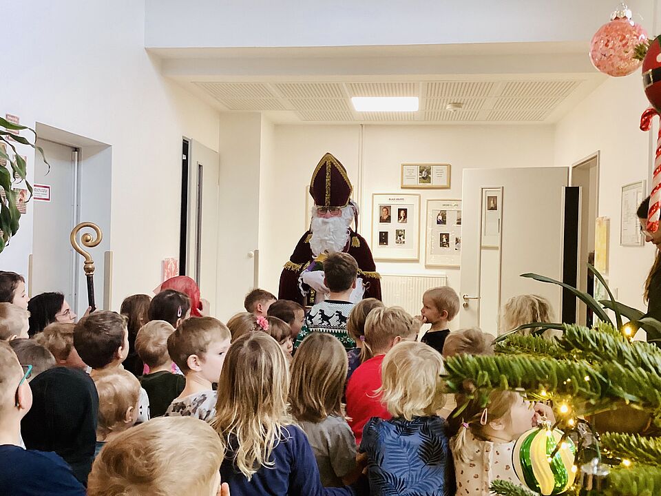 Zum Abschied bedankten sich alle herzlich beim Nikolaus und sangen ihm die letzte Strophe von „Sei gegrüßt, lieber Nikolaus“, bevor er sich verabschiedete und die Kinder ihm fröhlich nachwinkten.