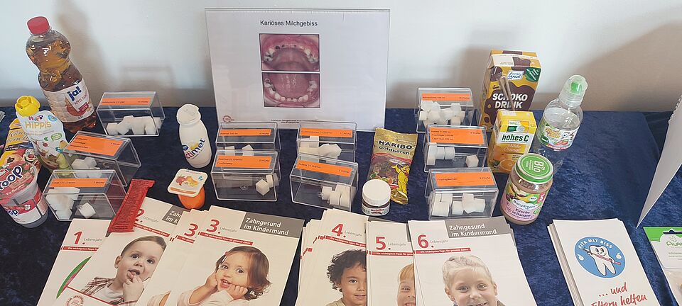 Im Eingangsbereich der KiTa hatte Frau Kunen dazu einen Tisch aufgebaut, auf dem für verschiedene Lebensmittel aufgezeigt wurde, wie viel Zucker sie enthalten. Die Darstellung zeigte sehr anschaulich für die Kinder, aber auch für die Eltern, wie viel Zucker in Lebensmittel enthalten und manchmal auch versteckt ist. Außerdem gab es ein gesundes und ungesundes Frühstück zum Vergleich und den Eltern wurde theoretisches Wissen in Form von Flyern und Broschüren mitgegeben. Die Eltern konnten sich an beiden Tagen umfassend über das Thema Zahngesundheit, das geeigente Zahnputzmaterial und das Thema gesunde Ernährung informieren.
